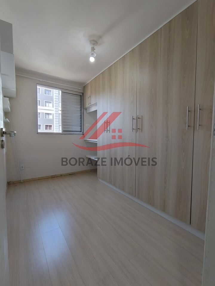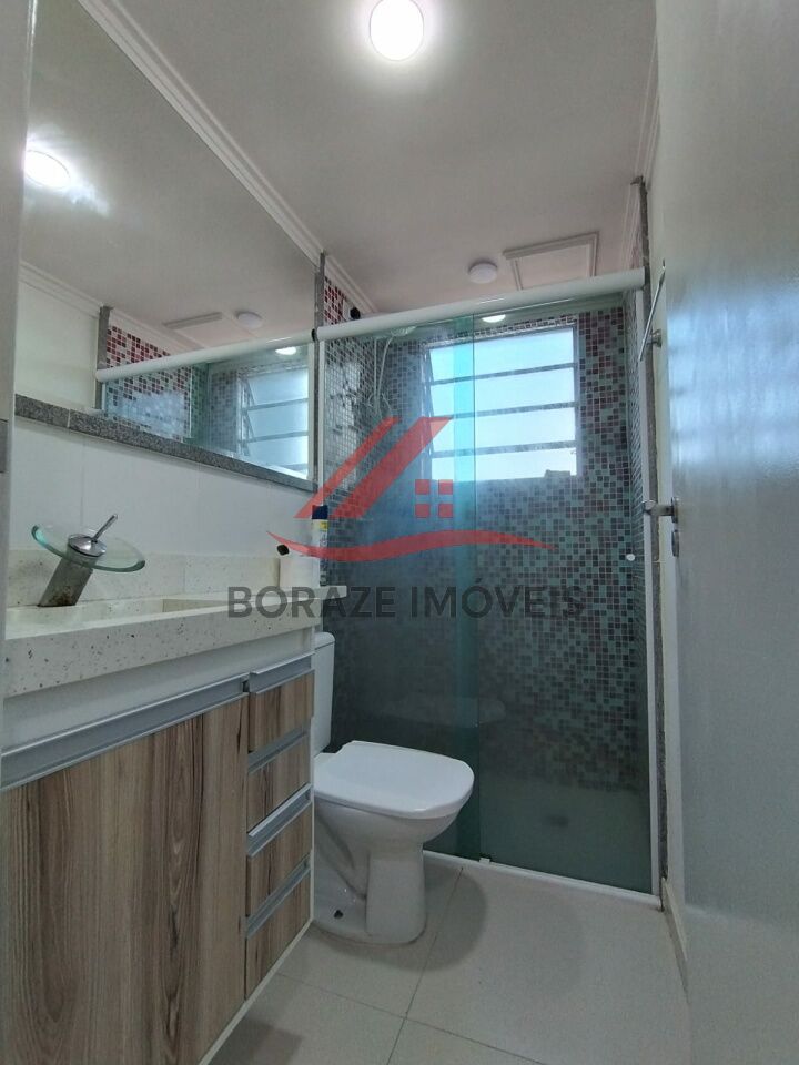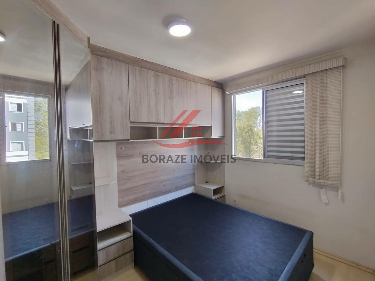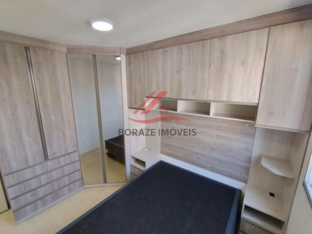 O imóvel conta com dois dormitórios equipados com móveis planejados, base para cama box de casal e painel para TV, oferecendo organização e melhor aproveitamento dos espaços. O banheiro possui box de vidro e gabinete, com acabamento funcional e moderno.