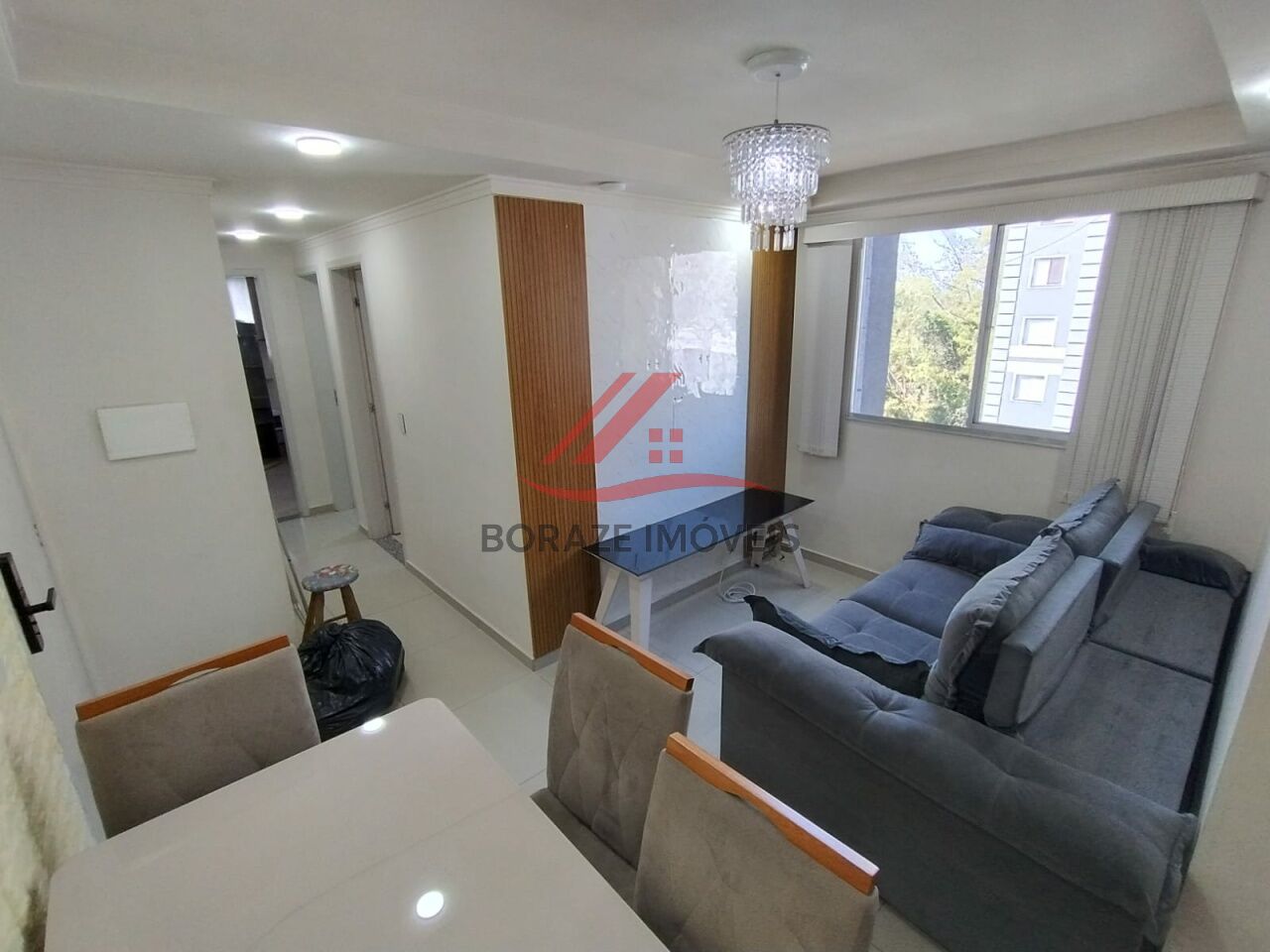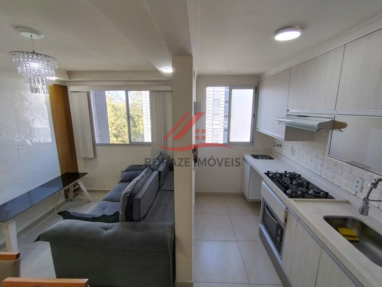 A sala é aconchegante e já dispõe de rack, painel e mesa de jantar com quatro cadeiras, proporcionando um ambiente pronto para morar. A cozinha americana é totalmente planejada e equipada com geladeira, forno, cooktop e micro-ondas, integrando praticidade e elegância ao dia a dia. A lavanderia é integrada e conta com armários aéreos, garantindo organização e funcionalidade.