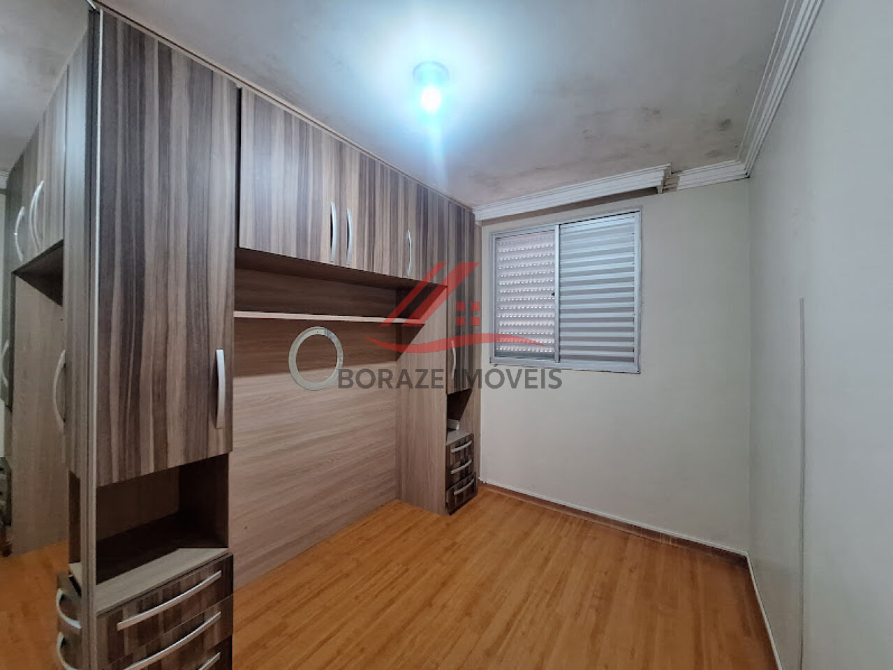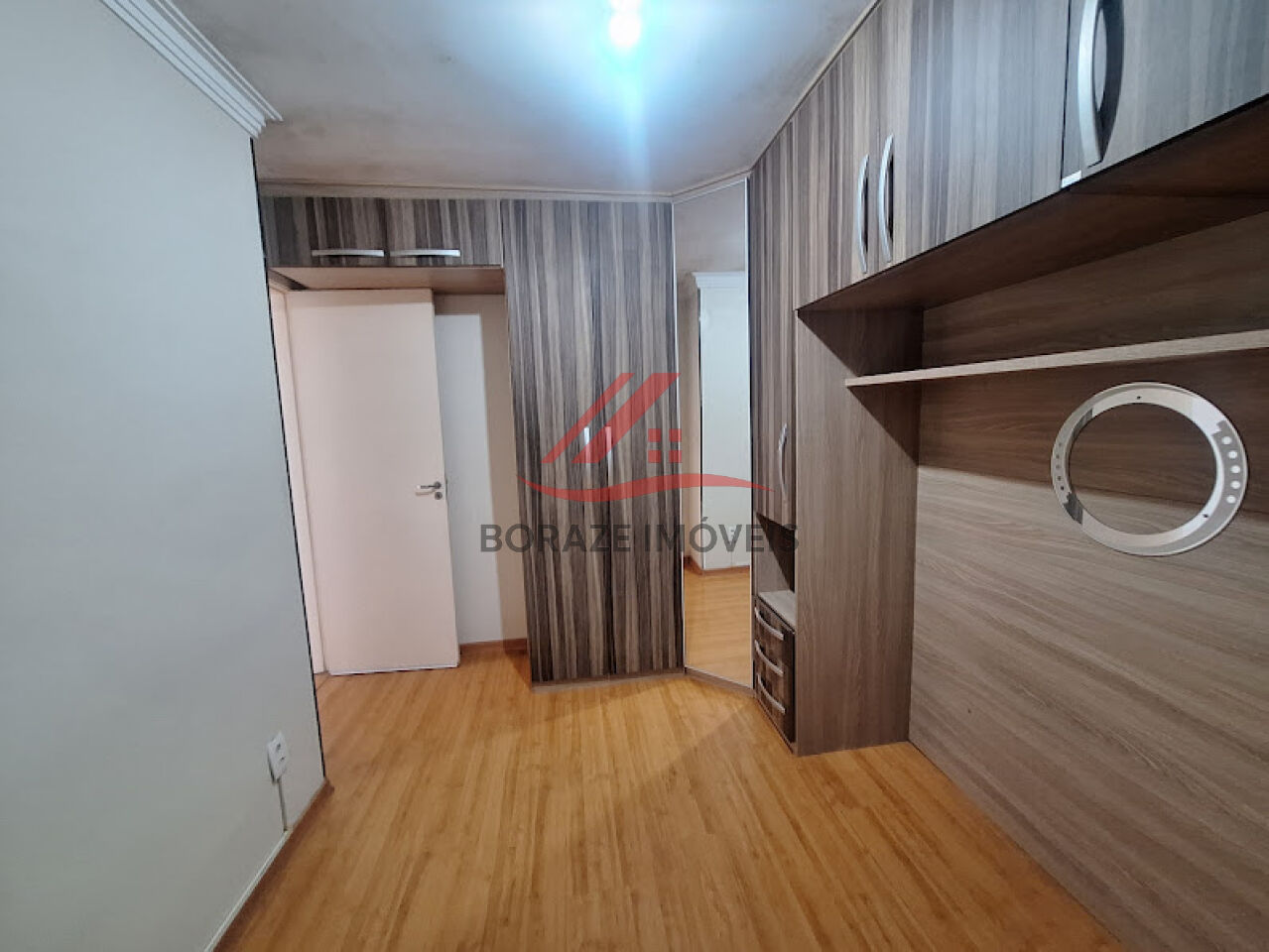 O primeiro quarto possui piso laminado amadeirado e armários embutidos, criando um ambiente aconchegante e elegante.