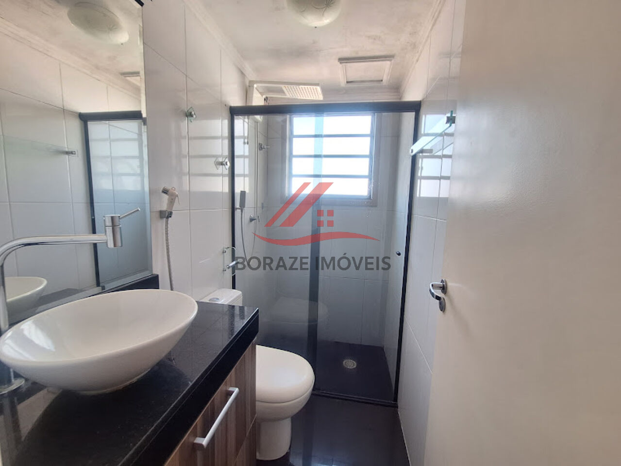 O banheiro se destaca pelo acabamento sofisticado, com bancada em granito, cuba sobreposta e box em vidro, oferecendo um ambiente moderno e bem cuidado.