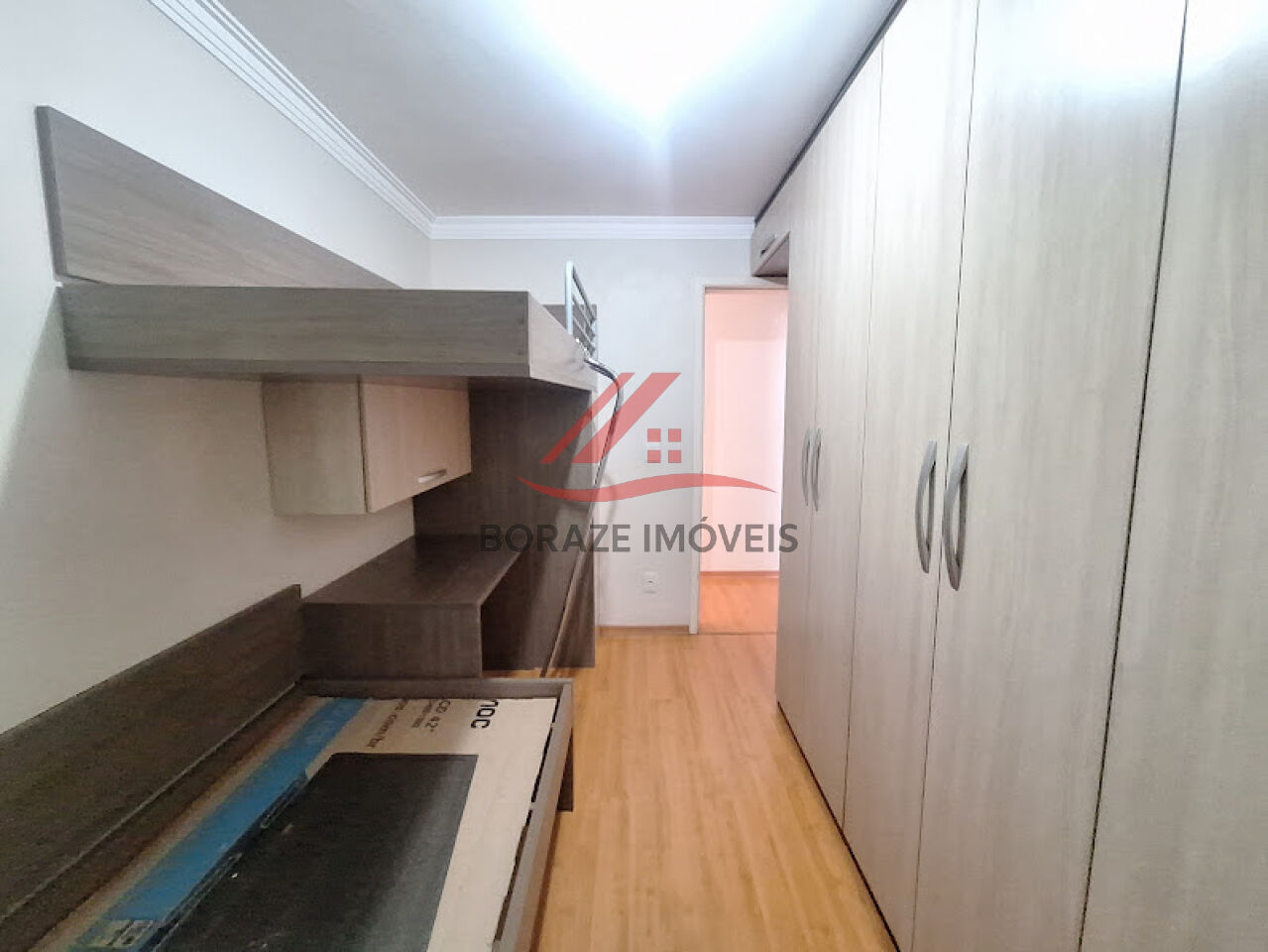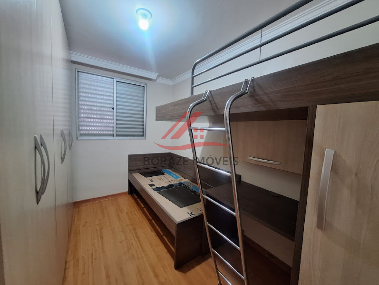O segundo quarto também conta com piso laminado e armário planejado, além de um diferencial inteligente: uma beliche moderna com cama e mesa embutidas, perfeita para otimizar espaço e trazer praticidade.